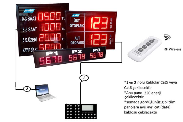 - Fonksiyon Kullanım Alanları: Otopark Fiyat Gösterge Panosu, Otopark Araç Sayma ve Kat Yönlendirme Bilgi Panoları, Otopark Boş Dolu Bilgilendirme Sistemleri, Otopark Otomasyon Panosu, İç Mekan ve Dış Mekan