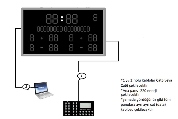1. SKOR GÖSTERGELERİ:Skor göstergeleri, bir müsabakada bulunan, seyirciler de dahil, herkesin en rahat görebilecekleri şekilde sistemin yapısı içerisine yerleştirilecektir ve saiseli olmalıdır. Uygulamada ana saat üst kısımda, üçer haneli takım skorları ise a1t iki yanda monteli olma1ıdır. Takım skorları hane yüksekliği en az 30 cm ve eleman dizimi yine en az üç sıralı ledlerden imal edilmiş olma1ıdırlar.