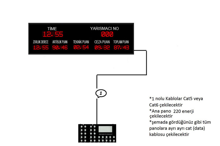 - SKOR GÖSTERGELERİ:Skor göstergeleri, bir müsabakada bulunan, seyirciler de dahil, herkesin en rahat görebilecekleri şekilde sistemin yapısı içerisine yerleştirilecektir ve saiseli olmalıdır. Uygulamada ana saat üst kısımda, üçer haneli takım skorları ise a1t iki yanda monteli olma1ıdır. Takım skorları hane yüksekliği en az 30 cm ve eleman dizimi yine en az üç sıralı ledlerden imal edilmiş olma1ıdırlar.